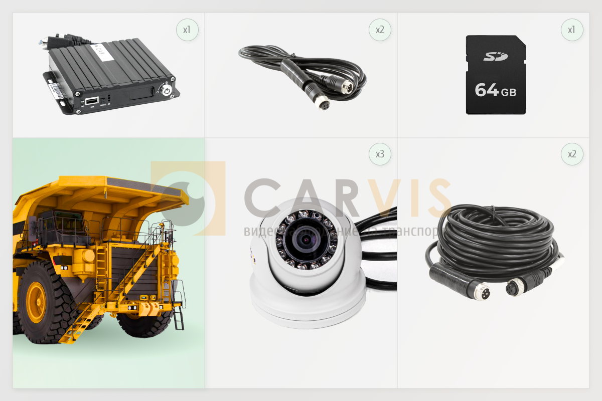 Предлагаемый комплект является стандартным решением для установки видеонаблюдения на карьерной технике. В зависимости от специфических потребностей вашей организации и особенностей транспортных средств, можно разработать индивидуальный комплект видеонаблюдения.
