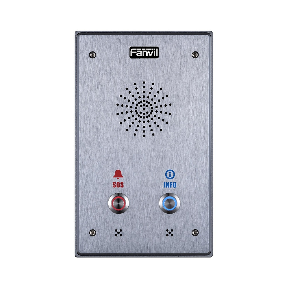Fanvil i12-02P — бюджетный аудиоинтерком начального уровня с поддержкой SIP и PoE с двумя кнопками вызова. Изготовлен из высокопрочного алюминиевого сплава и имеет неразборную конструкцию, что позволяет полностью защитить устройство от воздействия влаги и пыли (IP65) и от механических воздействий (IK10). i12-02 устойчив к экстремальным температурам от -40 до +70 ℃. Устройство поддерживает технологию шумоподавления: во время звонка интерком эффективно справляется с фоновым шумом, передавая голос в HD-качестве.