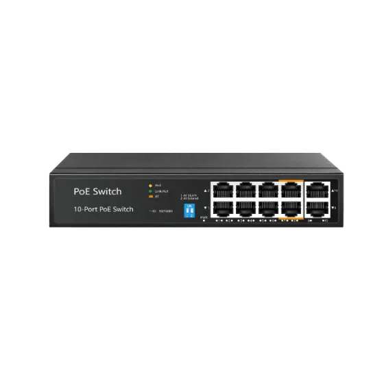 Данный сетевой коммутатор с десятью портами не имеет функции централизованного управления. Он оснащён функцией AI-PoE (watchdog) и поддерживает работу с восемью портами 10/100Base-TX с питанием PoE+ и двумя портами 10/100Base-TX.