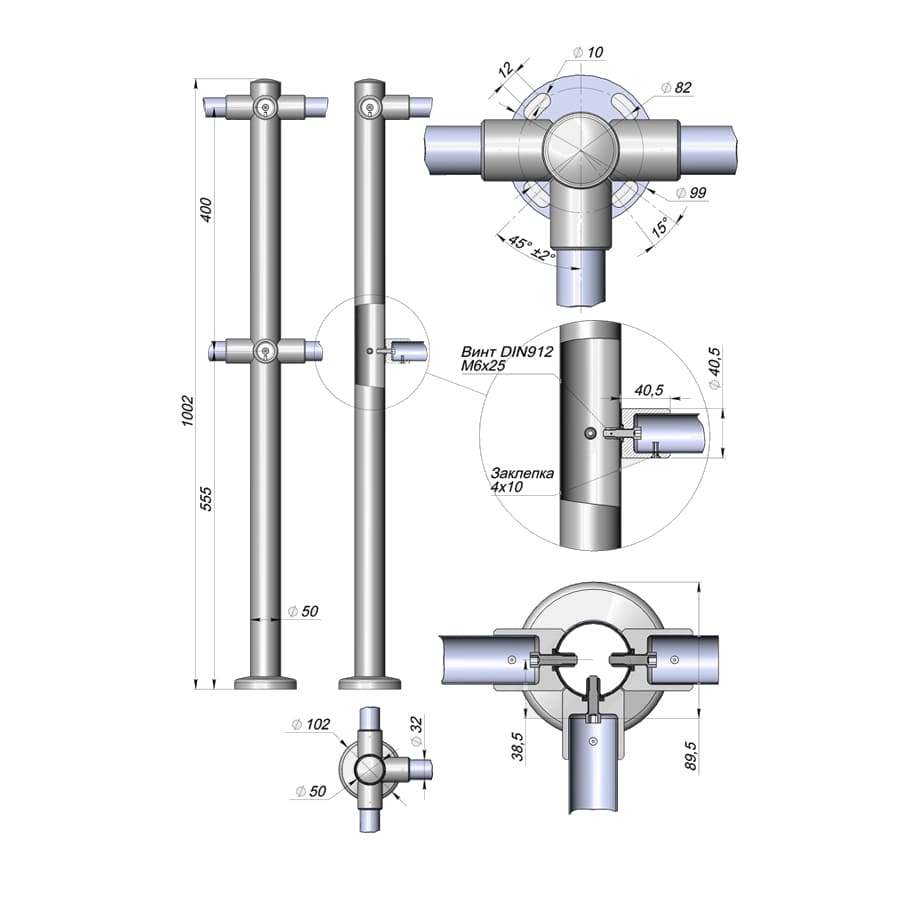 Стойка вертикальная 3V СВ-3 для формирования периметра Т-образной формы из секций модульного ограждения оснащена шестью гайками-заклепками, расположенными на двух уровнях по три под углом 90º. Гайки нужны для крепления стаканов устанавливаемых поручней.